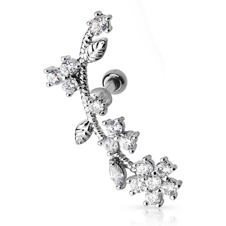 Barbell Ramo con fiori e foglie d´argento e zirconi